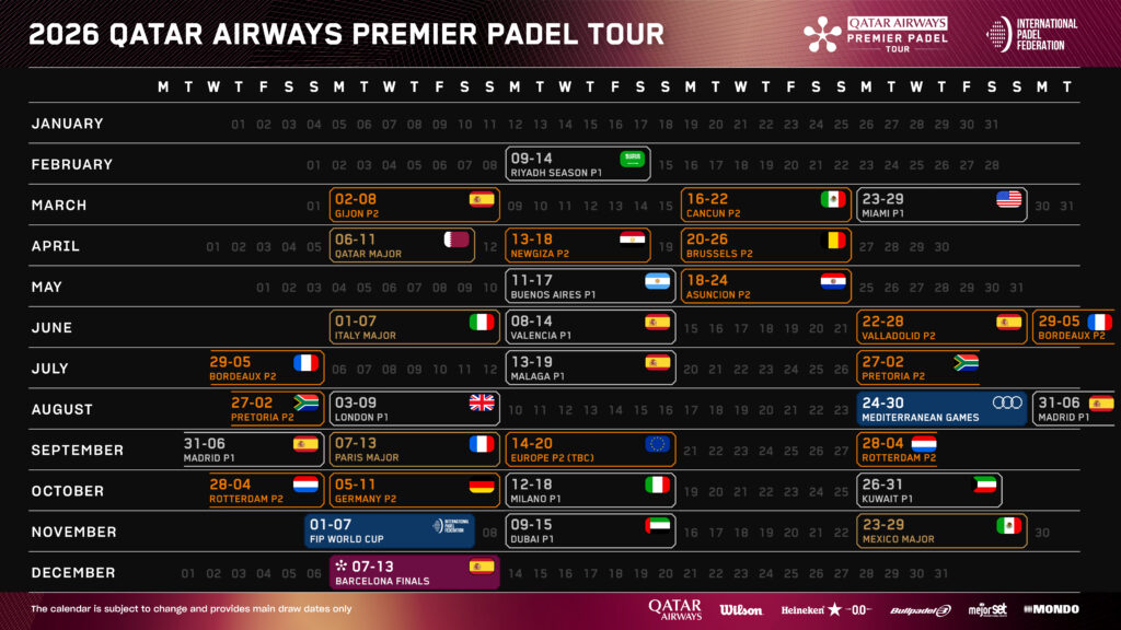 Premier Padel, el Circuito Profesional oficial de padel líder a nivel mundial, y la Federación Internacional de Padel (FIP), organismo rector del padel a nivel global, anunciaron el esperado calendario del Qatar Airways Premier Padel Tour 2026, que contará con 26 torneos en 18 países, con casi un 75 % de pruebas Indoor.